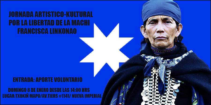 El día domingo 8 de enero, en Txokin Mapu, Avenida Thiers 1141 de Nueva Imperial, desde las 14 horas, se realizará una Jornada Artístico Cultural por la libertad de la Machi Francisca Linconao:
