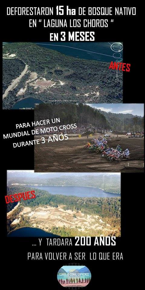 18 de marzo de 2017.- El Consejo Zonal Lafkence en defensa de los bosques nativos denuncia la deforestación de 15 hectáreas de bosque nativo realizada hace tres años atrás y que este año permite que se desarrolle la tercera carrera del circuito mundial de moto cross (para más información visita MXGP Argentina), actividades que causarían daño al ecosistema y a las comunidades Mapuche que se ven amenazadas.