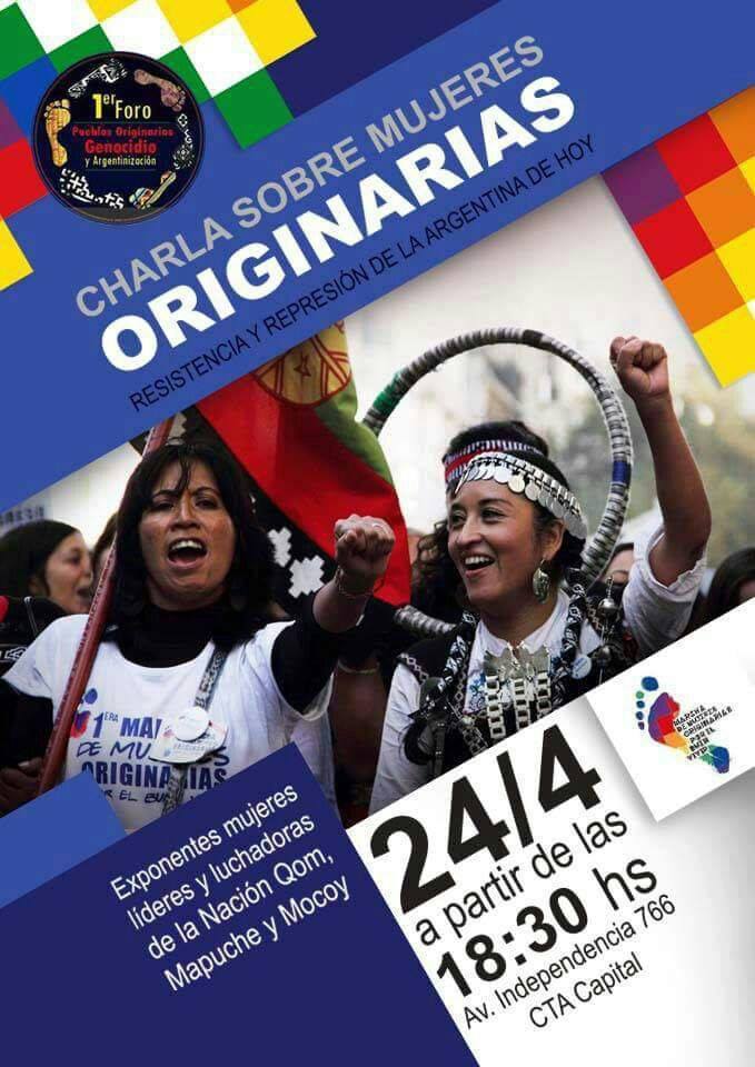 En el marco del primero foro de pueblos Originarios, genocidio y argentinización, se realizará el día 24 de abril a partir de las 18:30 horas, en CTA Capital, la Charla sobre mujeres originarias: resistencia y represión en la Argentina de hoy. Exponen mujeres líderes y luchadoras de las naciones Qom, Mapuche y Mocoy.