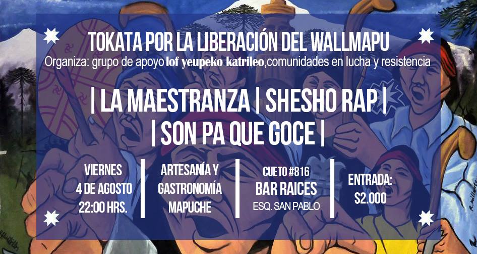 El día viernes 4 de agosto, a las 22 horas, en Raíces Bar (ubicado Cueto # 816, esquina San Pablo de Santiago), se realizará la siguiente actividad en apoyo a los presos políticos en huelga de hambre del caso Iglesia. La entrada tiene un valor de 2000 pesos y habrá artesanía, gastronomía y música.