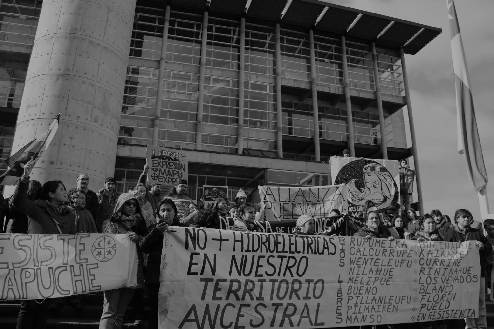 En julio en los inicios de las audiencias en el marco de la querella contra el medio Mapuexpress, cerca de un centenar de personas en su mayoría pertenecientes a diversas organizaciones, agrupaciones y comunidades defensoras de los territorios y opositoras al modelo extractivista, entre ellas: La Alianza Territorial PuelWillimapu, el Parlamento de Koz Koz de Panguipulli, Lof Trankura de Curarrehue, Comunidad Newen Tranguil de Liquiñe – Panguipulli, la Red de Defensa de los Territorios de la Araucanía y Los Ríos, la Coordinadora de Organizaciones de Derechos Humanos de Temuco, la Red de medios de los Pueblos, la Asociación Mapuche Rukamanke, Lof Quelhue de Pucón, organizaciones de Chiloé, entre otros, repudió esta criminalización a través de una protesta pública en Tribunales de Temuco y ha denunciado que detrás de esta acción penal “privada”, está el conflicto que viene generando el Banco Interamericano de Desarrollo (BID) e instituciones estatales a causa de políticas atentatorias y que están activamente rechazadas.