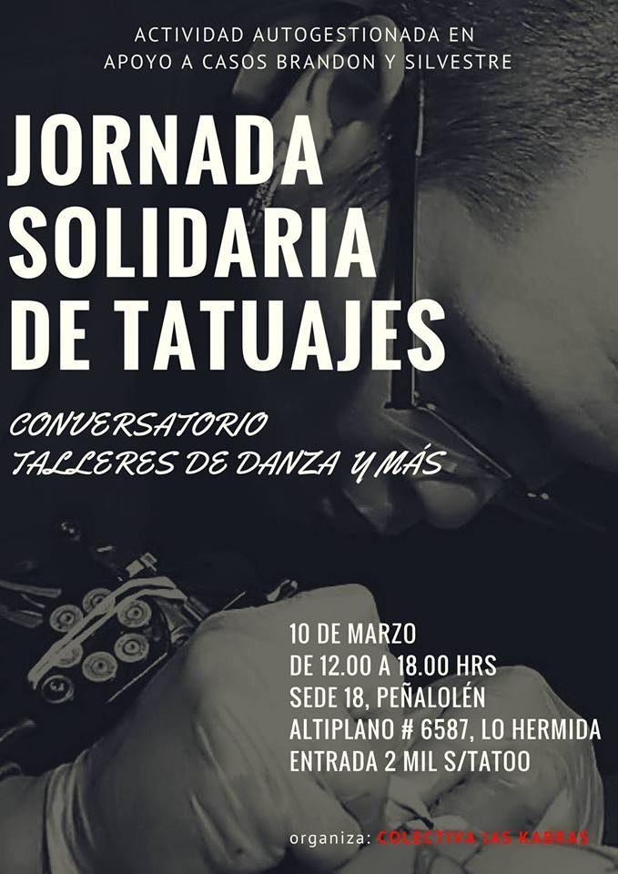La Colectiva las kabras invita a una Jornada solidaria de tatuajes en apoyo a niños Mapuche violentados por la policía chilena: Brandon Hernández Huentecol y Silvestre Torres Toro, a realizarse el día sábado 10 de marzo, desde las 12 a 18 horas en Altiplano #6587, Lo Hermida, Santiago. Así, invitan: «En apoyo activo a estas dos familias, les invitamos a esta jornada solidaria donde habrán tatuajes flash, talleres de danza y actividades para niñxs. Además, nos acompañarán Lorenzo Andrés Morales Cortés, abogado de la ONG Defensoría Popular, Ada Huentecol, la madre de Brandon y Guillermina Toro, la madre de Silvestre, con un conversatorio sobre conflicto Mapuche y violencia en Wallmapu. Para ver detalles del cronograma, tatuadorxs y talleres, abrir las publicaciones del evento. La entrada al evento para las personas que no se tatúen o no tomen taller, es de 2 mil pesos.