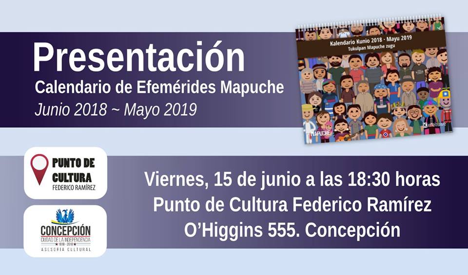 Kimeltuwe, materiales de mapudungun invita el viernes 15 de junio a las 18:30 horas a la presentación del Calendario de efemérides Mapuche , a realizarse en el Punto de Cultura Federico Ramírez ubicado en O’higgins 555, Concepción.