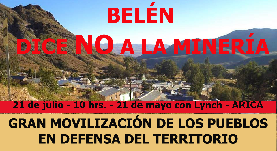 14/07/2018.- El pueblo de Belén convoca a sus descendientes, hijos e hijas de pueblos las comunas Putre y General Lagos, y comunidad regional en general, a sumarse a “Belén Dice NO a la Minería: Gran Movilización de los Pueblos en Defensa del Territorio”, a realizarse el 21 de julio desde las 10.00 horas en Patricio Lynch con 21 de mayo, en rechazo al proyecto minero Trinidad que realiza la transnacional Río Tinto en los territorios de Belén.