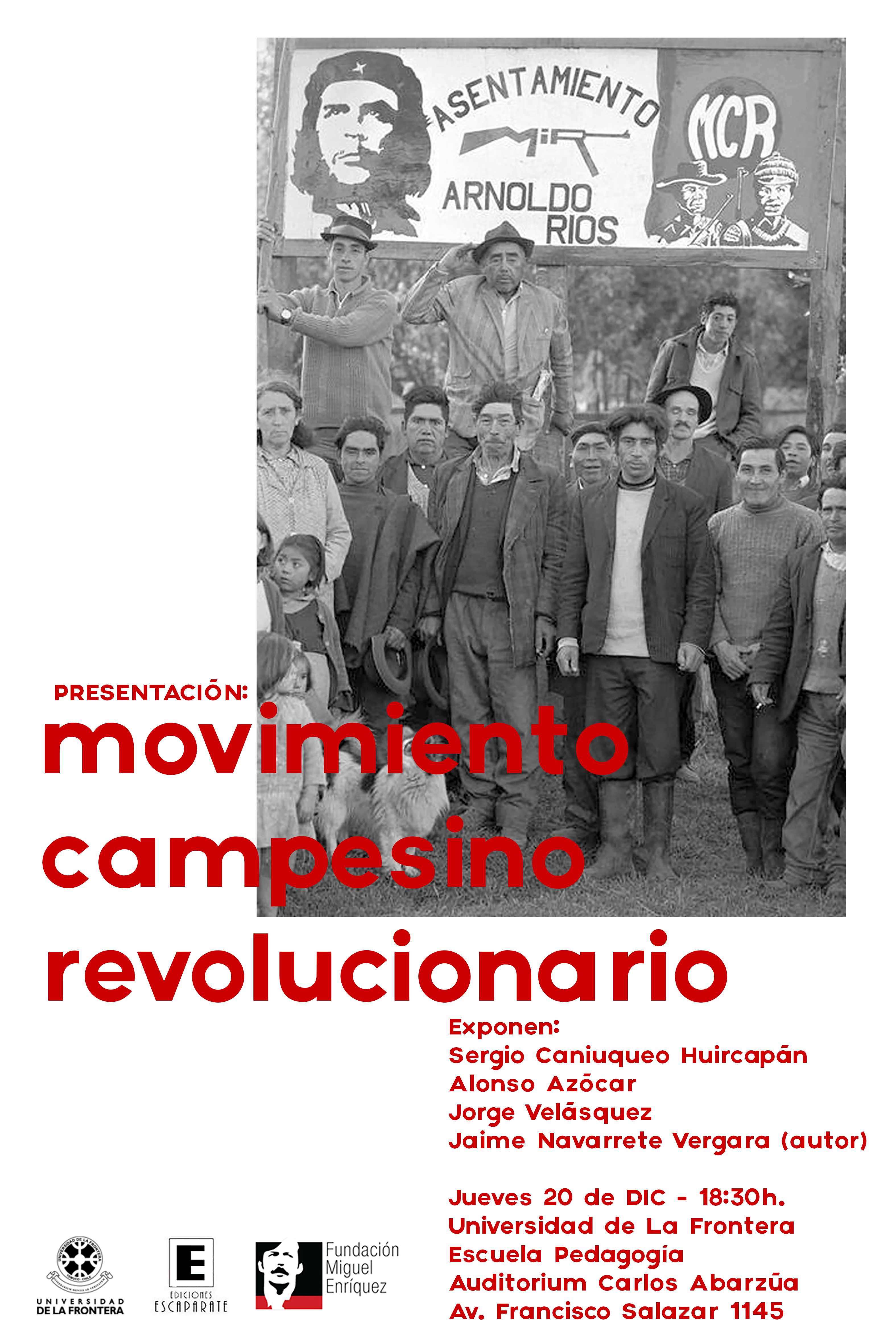14/02/2018.-El día jueves 20 de diciembre de 2018, a las 18:30 horas, en la Facultad de Pedagogía de la Universidad de la Frontera en Temuco (Auditorium Carlos Abarzúa), se presentará el libro de Jaime Navarrete Vergara, titulado: “Movimiento Campesino Revolucionario (Cautín, 1970-1973)”, publicado por Editorial Escaparate.