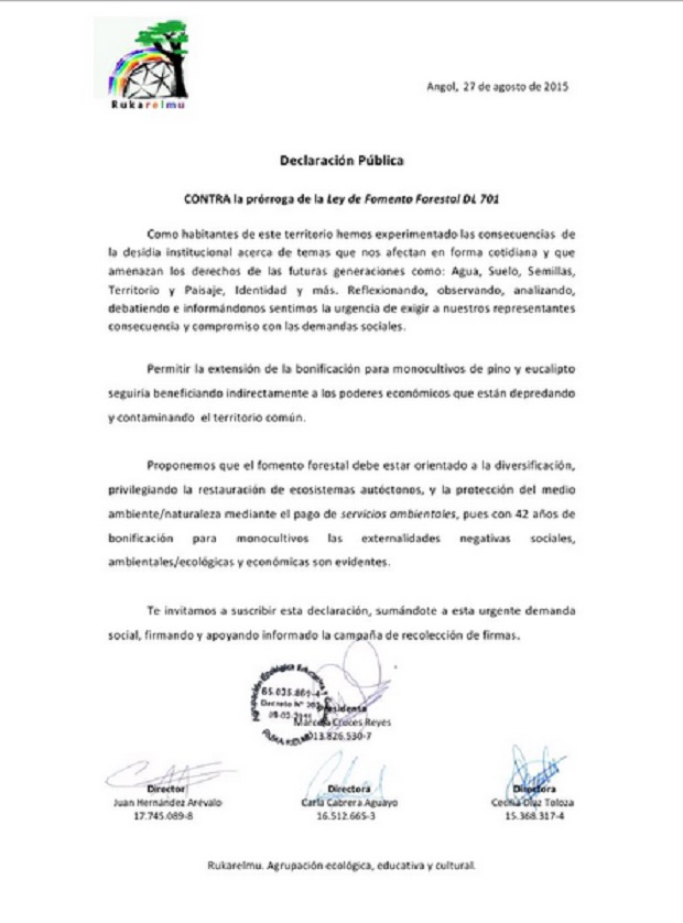 Angol, Declaración Pública CONTRA la prórroga de la Ley de Fomento Forestal DL 701 «Como habitantes de este territorio hemos experimentado las consecuencias de la desidia institucional acerca de temas que nos afectan en forma cotidiana y que amenazan los derechos de las futuras generaciones como: Agua, Suelo, Semillas, Territorio y Paisaje, Identidad y más. Reflexionando, observando, analizando..»