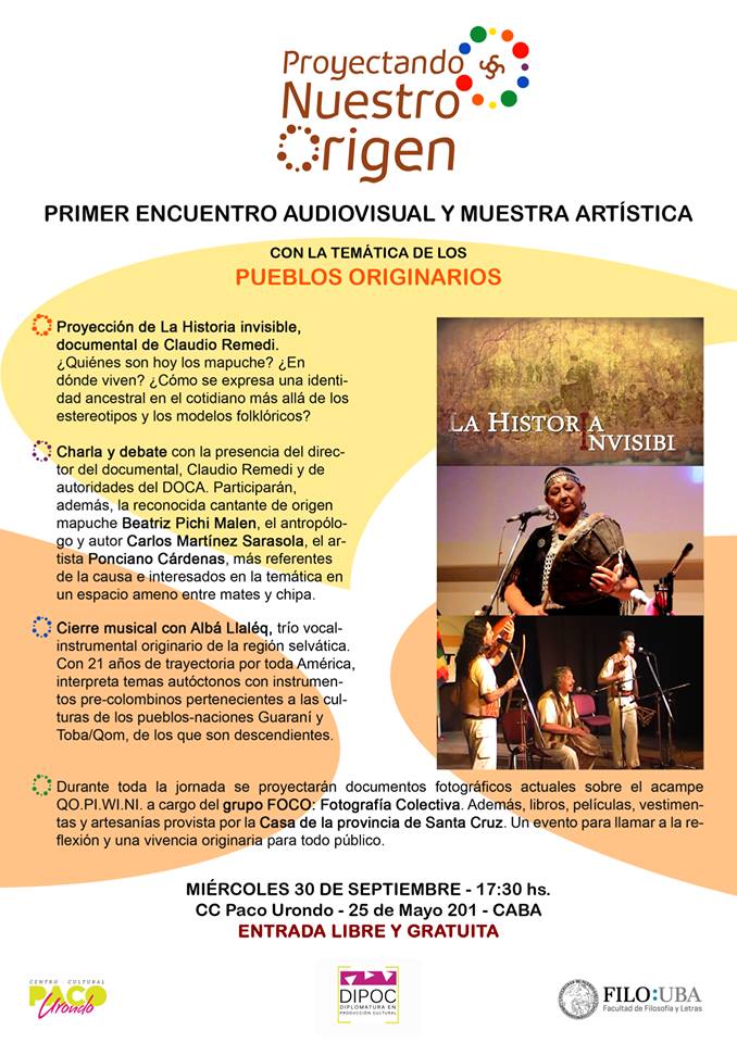 Durante la jornada se proyectará el documental La Historia invisible, que pone en foco a los Pueblos Originarios y su situación en la actualidad: ¿Quiénes somos los aborígenes hoy? Contaremos con la presencia del director del documental, Claudio Remedi, y de autoridades en la temática como y el referente de la Carpa Qo.Pi.Wi.Ni Félix Diaz, la reconocida cantante mapuche Beatriz Pichi Malen, el antropólogo e investigador Carlos Martínez Sarasola y el escultor y pintor Ponciano Cárdenas quienes, junto al público, llevarán adelante una charla-debate sobre identidad aborigen.