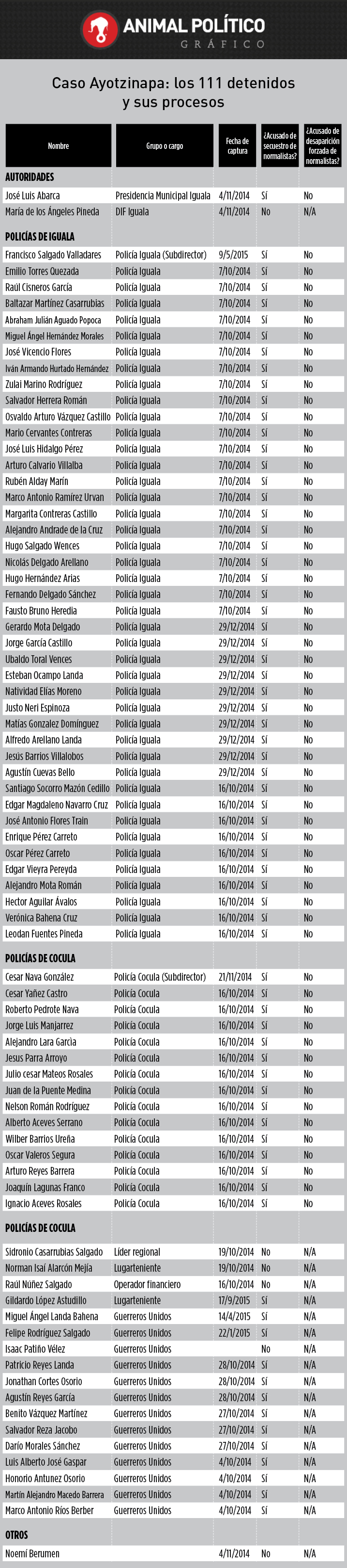 Aunque hay 111 personas detenidas como resultado de la averiguación abierta en la PGR por el caso de los normalistas desaparecidos, la revisión de los datos públicos disponibles y del Consejo de la Judicatura solo permite confirmar que 73 de ellos están acusados del plagio de los estudiantes.