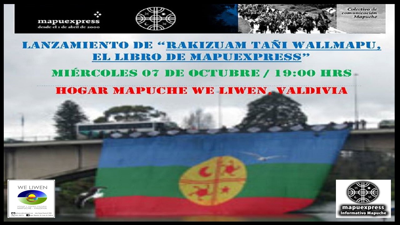 El Colectivo Informativo Mapuexpress  presentará el libro  “Rakizuam Tañi Wallmapu, el libro de Mapuexpress”, con 15 años de trabajo, que se desarrollará este día miércoles 07 de octubre a las 19:00 hrs., en el Hogar Mapuche We Liwen, Av. Ramón Picarte #2330, Ainileufu (Valdivia). Dicha presentación será acompañada  de la intervención de música y poesía mapuche.