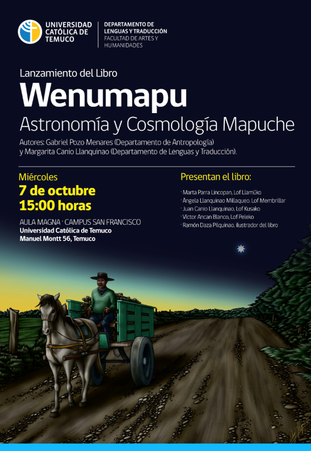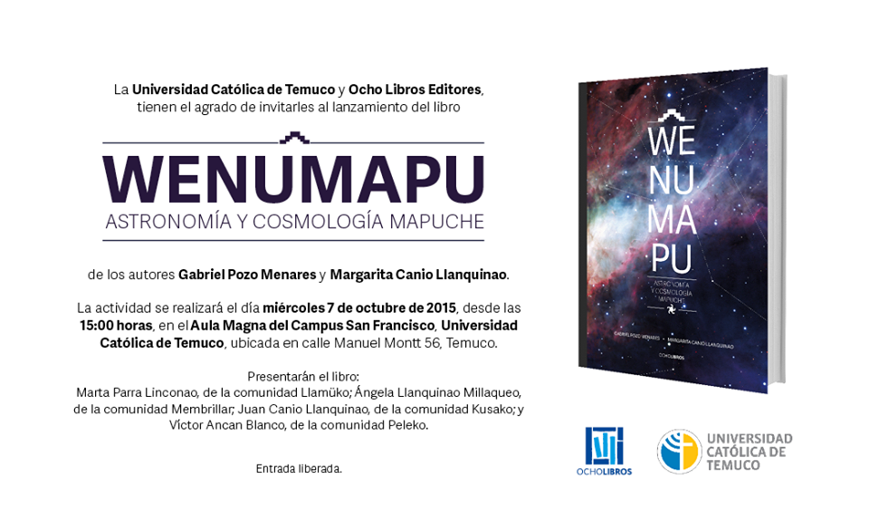 El miércoles 7 de octubre, desde las 15:00 horas, en la Universidad Católica de Temuco, Aula Magna del Campus San Francisco, será presentado el libro: «Wenumapu, astronomía y cosmología mapuche» de Margarita Canio Llanquinao y Gabriel Pozo Menares.