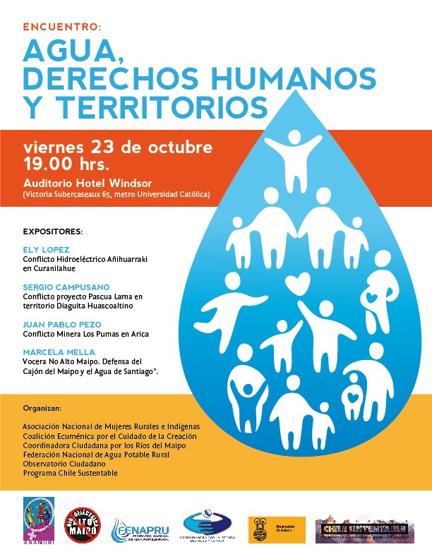 viernes 23 de octubre se realizará el encuentro: “Agua, Derechos Humanos y Territorios”,organizado por Chile Sustentable, Observatorio ciudadano, Federación Nacional de Agua Potable Rural, la Coordinadora ciudadana por los Ríos de Maipo, la Coalición ecuménica por el cuidado de la Creación y la Asociación Nacional de Mujeres Rurales e Indígenas.