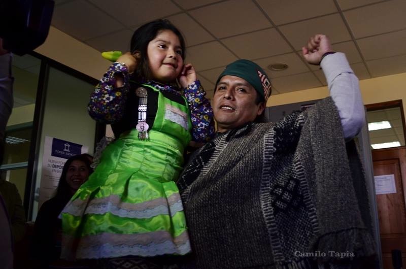 José Wenuche a la salida del juicio el día 21 de octubre de 2015 junto a su pequeña hija Llanka. Foto: Camilo Tapia.