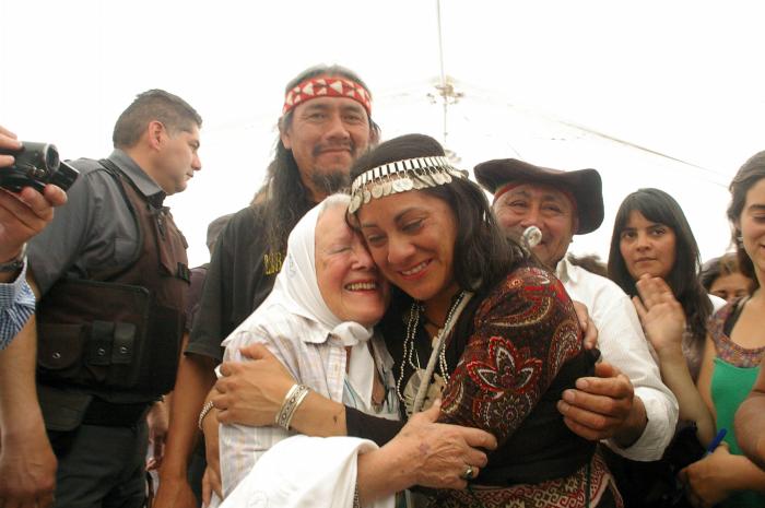 Relmu Ñamku se abraza con la Madre de Plaza de Mayo Nora Cortiñas al terminar el juicio / Marcelo Mercado, Río Negro