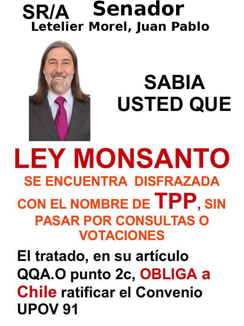 “No queremos dejar el futuro económico de nuestro país en manos de mercados internacionales; no queremos ser gobernados por EEUU; no queremos vender nuestra semilla indígena nativa; no queremos ser alimentados con cáncer; no queremos ser vulnerados en nuestros Derechos Fundamentales. Queremos pedirle especialmente que en este tema actúe de cara a la ciudadanía a la que representa, manifestando abiertamente su postura al respecto (a través de una respuesta al correo electrónico redsocioambientalsemillas@gmail.com), y haciéndonos partícipes de la decisión que se tome, ya que antes del lobista, del economista, del empresario, usted representa a cada hombre y cada mujer de esta Región, quienes han confiado en usted las decisiones que configuran el destino futuro de Chile.
