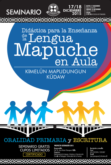 En el Auditorio de la Escuela de Pedagogía de la Universidad de La Frontera , Temuco, Chile, se realizará el día jueves 17  y viernes 18 de diciembre desde las 8:30 horas en adelante,  el Seminario «Didáctica para la Enseñanza de la Lengua Mapuche, Oralidad Primaria y Escritura: Kimelün mapudungun küdaw», actividad que viene en continuación de los Coloquios para la Enseñanza y Aprendizaje del Mapuchedungun iniciados tras un largo y necesario transitar hace doce años atrás.