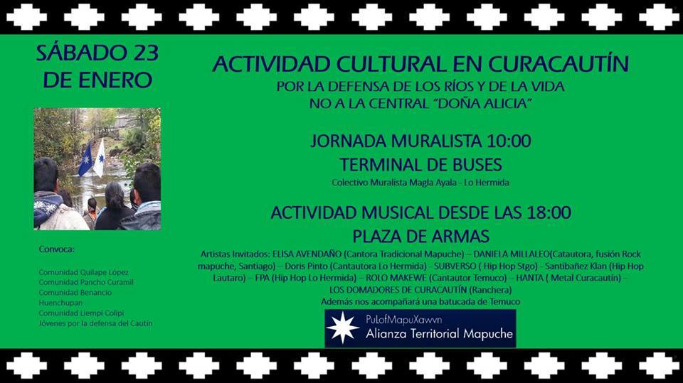 Curacautin, una comuna caracterizada por esconder la presencia mapuche y ensalzar la figura del colono y sus apellidos extranjeros como lo Pdleche; hoy –en plena plaza “de armas”- se apresta a presenciar un masivo acto artístico-cultural, político y de denuncia a efectuarse el próximo sábado 23 de enero desde las 10 horas, organizado por las comunidades mapuche de la zona y jóvenes de la ciudad. Acto que –según los organizadores- busca dejar un claro mensaje al poder coludido entre la política y el empresariado de que no se aceptarán proyectos de inversión extractiva atentatorios contra los curso de los ríos en Curacautin, y que los mapuche aliados con los chilenos conscientes se encargarán de hacer respetar esa decisión.