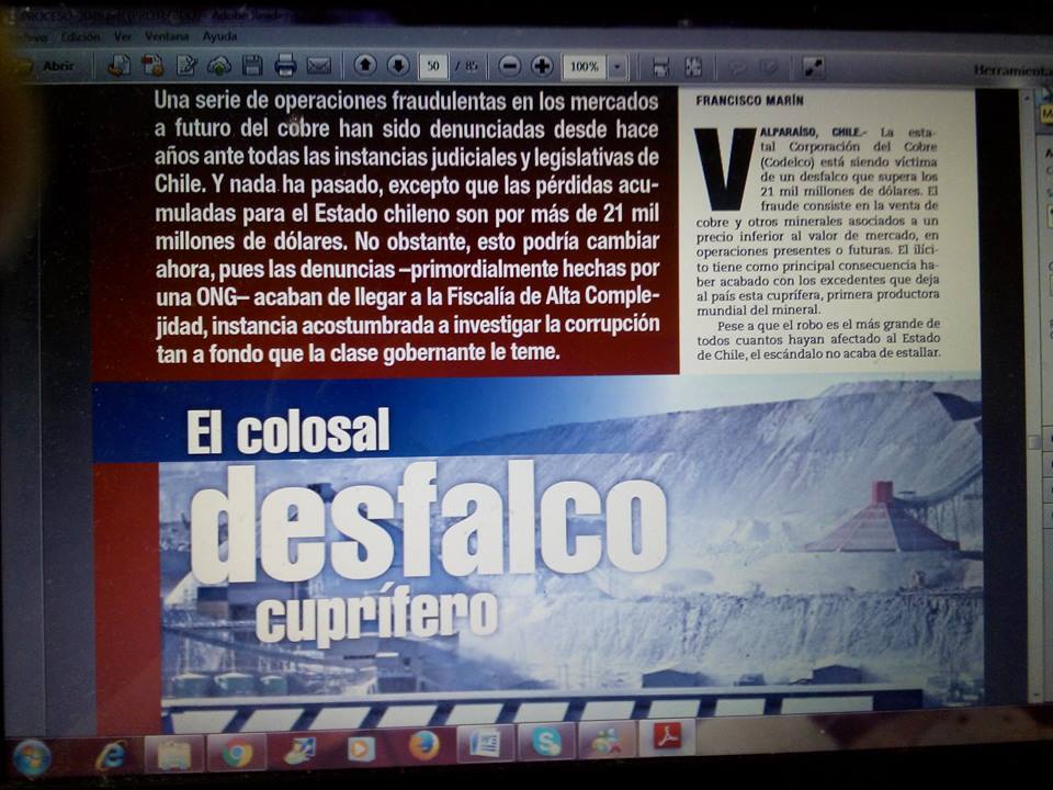 Reporta El colosal desfalco cuprífero, publicado hoy en revista Proceso (México). El monto defraudado: 21 mil millones de dólares. Acá nota completa.