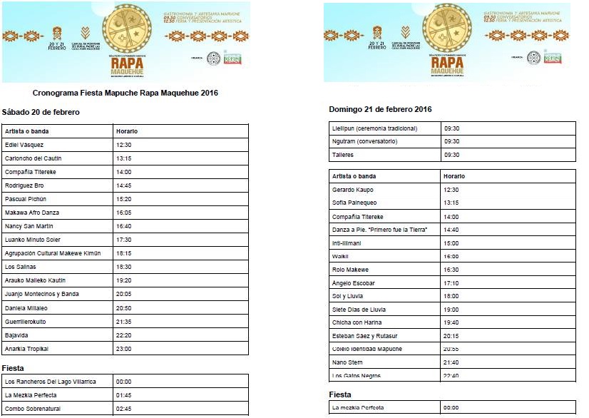 La tercera versión de la Fiesta Costumbrista Mapuche Rapa Makewe tendrá un importante encuentro artístico cultural que se realizará este fin de semana, 20 y 21 de febrero, desde las 9.30 horas en la cancha de Porvenir del sector rapa Maquehue, a 5 kilómetros de la comuna de Padre las Casas y a 2,5 km. del ex Aeropuerto Maquehue.