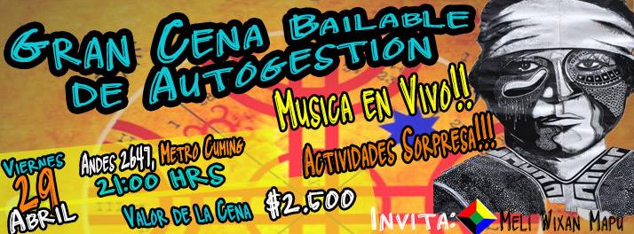 Invitamos cordialmente a todas y todos a una nueva cena bailable de autogestión, la que servirá para continuar con nuestro trabajo autónomo y autogestionado que llevamos realizando hace ya muchos años como colectividad organizada en la warria.