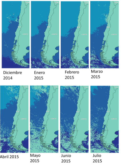Frente a eso, es necesario contrastar ambas posturas con información geográfica. Primero, la extensión de la corriente de El Niño se puede identificar por la temperatura superficial del mar. O sea, se debería identificar un aumento significativo de la temperatura para poder decir que eso afectó a la fauna marina. Para identificar ese aumento, busqué imágenes satelitales procesadas con la Temperatura Superficial del Mar (SST), provenientes del sensor MODIS- Aqua (NASA), desde Diciembre de 2014 a Febrero de 2016, fecha que se indica que fue la mortandad masiva de salmones (todavía no están disponibles las imágenes de marzo y abril) [4]. El resultado se puede ver en las imágenes 1 y 2.