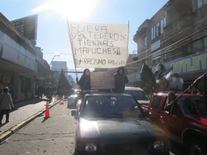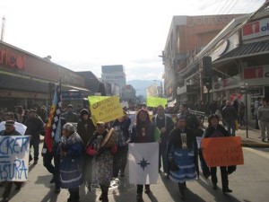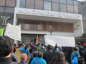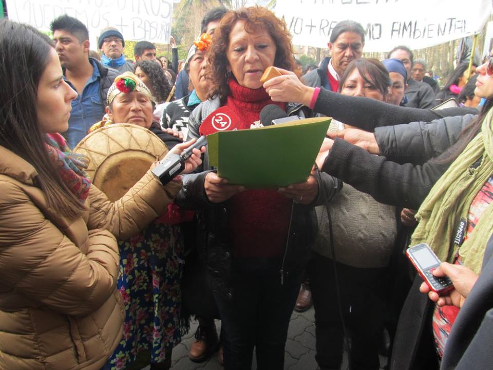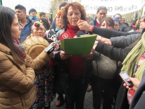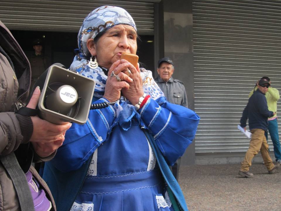 La Machi María Lienmil en una intervención púbica en el centro de Temuco, exigió respeto al Alcalde y al Intendente y criticó la forma en que han sido tratados, en momentos en que las puertas de la intendencia y la municipalidad se cerraban con cortinas metálicas impidiendo el acceso.