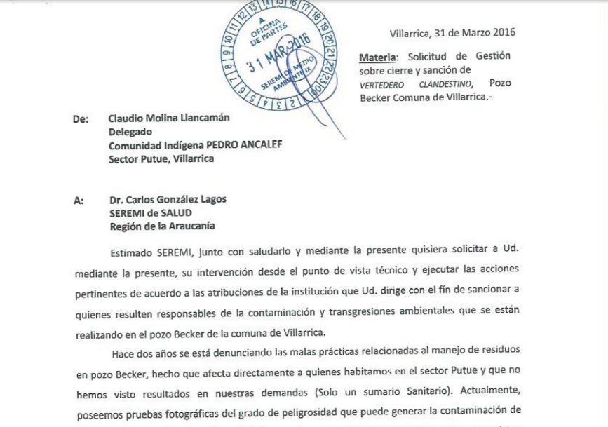 Desde la comunidad han extendido la siguiente información: “Se comparte una serie de antecedentes que hacen referencia a la intransigencia que se ha cometido en la Comunidad Pedro Ancalef del sector Putue en la comuna de Villarrica, donde el Municipio de Villarrica mantiene un vertedero clandestino que ha sido sumariado en dos oportunidades por la autoridad sanitaria y que si bien en el último sumario se decretó la prohibición de funcionamiento aún sigue recibiendo basura, sobre todo de las edificaciones que hacen grandes constructoras en la zona lacustre las que se niegan a eliminar sus residuos en lugares autorizados”.