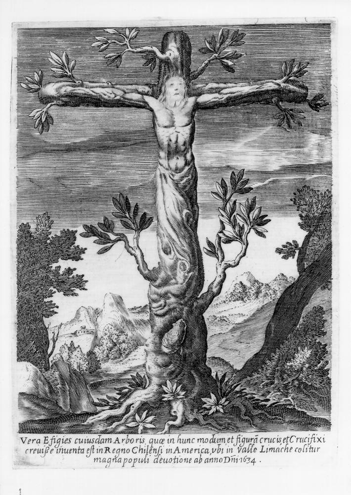 Foto: La imagen que se acompaña corresponde a La Cruz de Limache o el Cristo del Canelo (Foye, arbol sagrado Mapuche), considerada una ilustración de sincretismo del año 1634 / extraído de “Acerca del sincretismo visual”