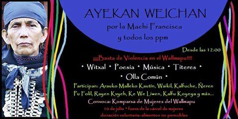 La Agrupación Komparsa de Mujeres del Wallmapu se encuentra organizando una actividad para el domingo 10 de julio en las afueras de la cárcel de mujeres de Temuco y que ha denominado: “Ayekan Weichan para la MACHI Francisca Linconao y tods ls presos políticos”, la que tendrá además intervenciones artísticas, culturales, conversatorio, olla común, entretención infantil, transmisión radial, entre otras.