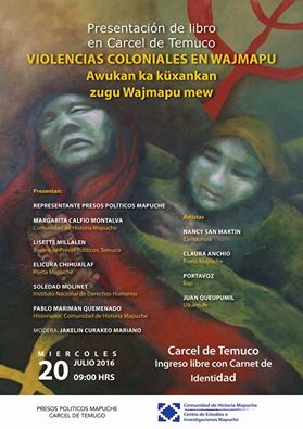 Miércoles 20 de Julio 2016. Lanzamiento en Carcel de Temuco del libro Awukan ka Kuxankan zugu Wajmapu Mew. Violencias coloniales en Wajmapu. Hora: 09:00.