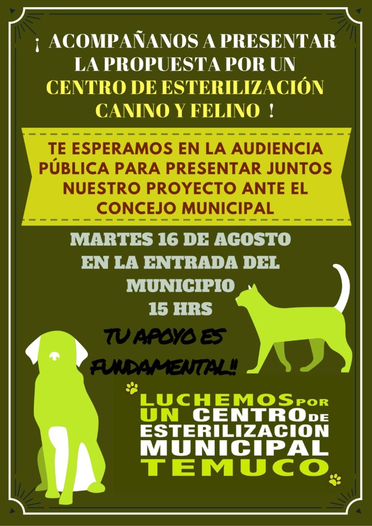 El pasado sábado 06 de agosto se realizó en Temuco la “I Jornada de Sensibilización sobre Convivencia Responsable con animales de compañía”, actividad autogestionada y organizada por la “Coalición por un Centro de Esterilización Municipal en Temuco”. El objetivo de esta jornada consistía en educar de manera informada sobre métodos de control de población canina, lo cual fue considerado como un logro cumplido según los organizadores. En una extensa jornada, que contó con un intermedio donde se sirvió almuerzo vegano a todos los asistentes, expusieron diversos profesionales de las áreas legal, veterinaria y de gestión territorial, analizando desde diversas miradas el modelo actualmente usado en nuestra comuna, el que está basado en el sistema de retiro y acopio, el que fue comparado con el modelo propuesto por la OMS, el cual se fundamenta en 2 ejes principales que son la educación y el control de natalidad.