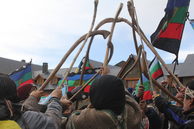 Frente al Lago Nahuel Huapi, y frente al monumento al genocida Julio Argentino Roca, integrantes de los pueblos Mapuche, Tehuelche, Shel´nam (Selknam), Gununa kuna, alzamos nuestra voz, reivindicamos nuestra permanencia en los territorios, y defendemos nuestros derechos, tal como lo hicieron nuestros queridos ancestros, Inakayal, Foyel y tantos otros.