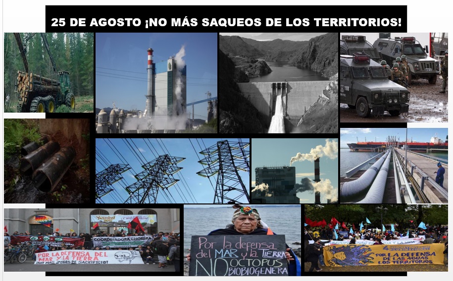 Este 25 de agosto en diversos puntos del centro sur de Chile (también conocido ancestralmente como territorio de Ngulumapu, parte oeste del Wallmapu), se realizarán diversas manifestaciones de protestas contra el saqueo del País. La Región del Bio Bio, La Araucanía, Los Ríos, Los Lagos – Chiloé, en gran parte de sus territorios, en medio de espacios indispensables para el desarrollo de la vida de todos y de todas, tanto rural como urbana, se siguen propagando numerosos proyectos vinculados a las industrias capitalistas neoliberales y extractivistas.