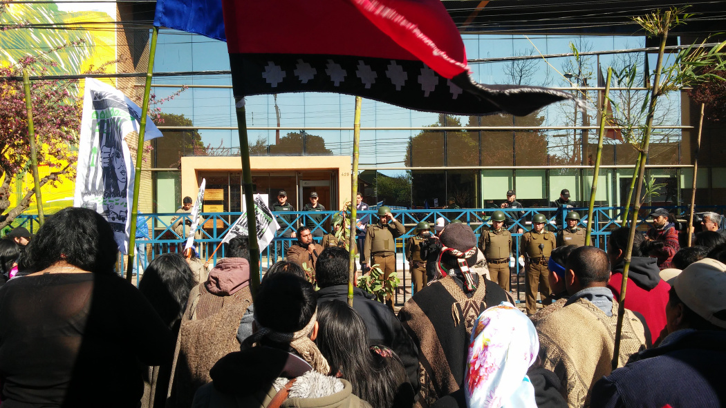 Alrededor de 300 personas, entre ell@s pu lonko y pu werken de diferentes territorios, fueron parte de la marcha y llellipun que se realizó fuera de tribunales en solidaridad con los imputad@s Daniel, Juan y Elisa y en repudio a la criminalización que ejercen carabineros y la fiscalía en contra de la comunidad Wente Winkul Mapu y de todas las comunidades mapuche movilizadas por recuperar su territorio usurpado por el Estado Chileno.