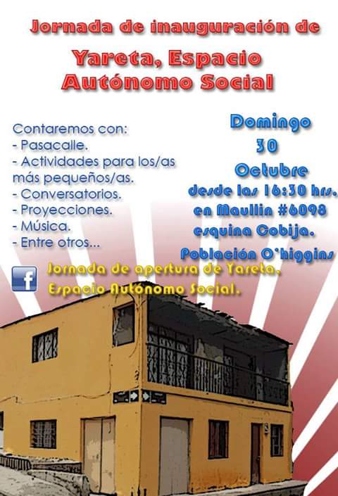 El día domingo 30 de octubre, desde las 16:30 horas, en Población O’higgins (Calle Maullín #6098) de Antofagasta; se realizará la Jornada Apertura del Espacio Autónomo Social Yareta, actividad gratuita y abierta a todo público. La jornada contará con pasacalles alrededor de la población, diversos talleres durante el día (especialmente enfocado a lxs niñxs), conversatorios, Proyecciones,música y más.