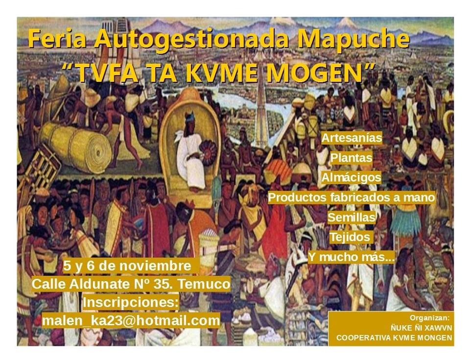 Los días 5 y 6 de noviembre, desde las 11 horas, en Calle General Aldunate 35, Temuco; se realizará la Feria Autogestionada Mapuche Tvfa Kvme Mogen; actividad organizada por Ñuke ñi xawvn y la coopertiva Kvme Mogen. La actividad constará con artesanías, plantas, almácigos, productos fabricados a mano, semillas, tejidos, y más.