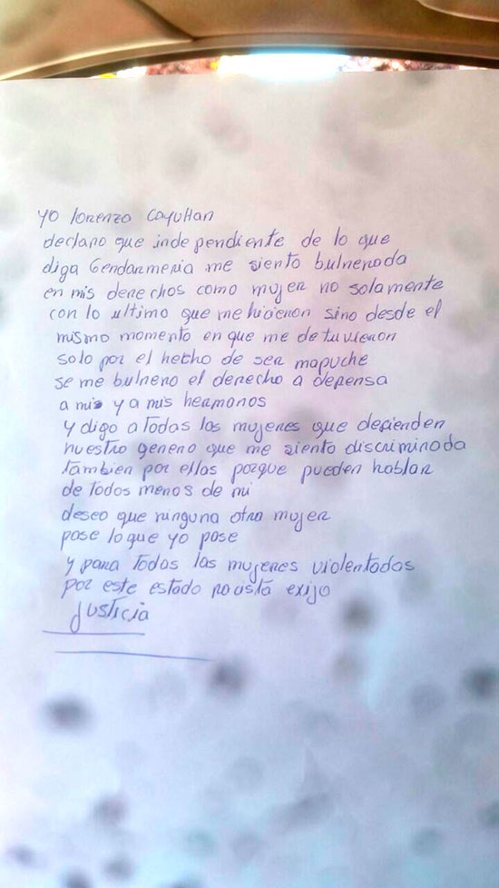 “Yo, Lorenza Cayuhan declaro que, independiente de lo que diga Gendarmería, me siento vulnerada en mi derecho como mujer, no solamente con lo último que me hicieron, sino desde el mismo momento que me detuvieron. Solo por el hecho de ser mapuche, se me vulneró el derecho a defensa a mí y a mis hermanos. Y digo a todas las mujeres que defienden nuestro género que me siento discriminada también por ellas, porque pueden hablar de todas, menos de mí. Deseo que ninguna otra mujer pase por lo que yo pasé. Y para todas las mujeres violentadas por este estado racista, exijo JUSTICIA”.