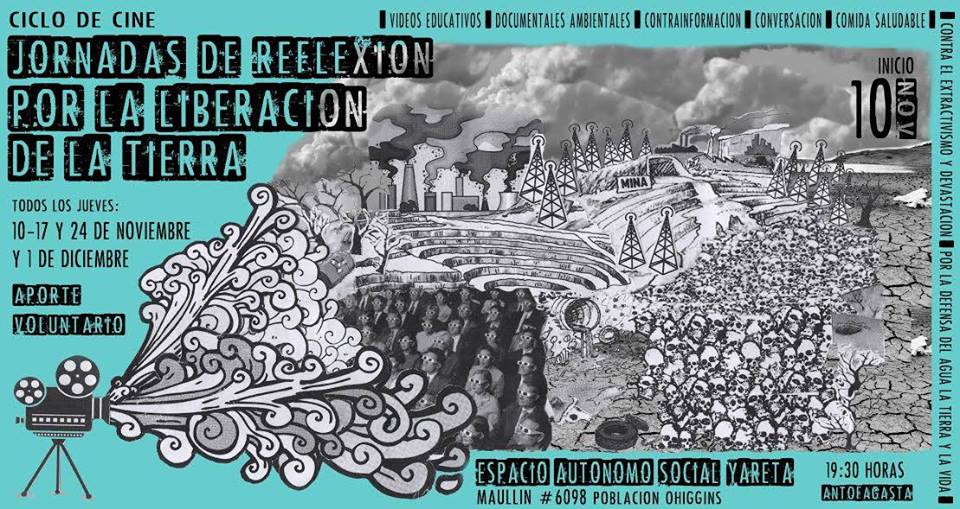 En el Espacio Autónomo Social Yareta de Antofagasta, ubicado en Maullín #6098 de la Población O’higgins, se realizará todos los días jueves desde las 19:30 horas, los Ciclos de Cine llamados: «Jornadas de reflexión por la liberación de la tierra».