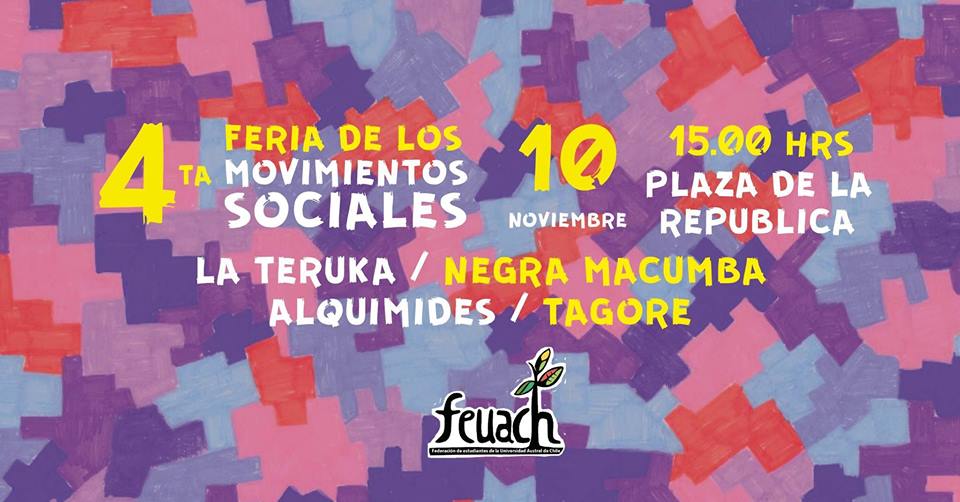 Desde la Feuach y los CEE’s de nuestra Universidad, Invitamos a toda la comunidad valdiviana y de la región de los ríos, a hacerse participes de la IV Feria de Movimientos Sociales: “Santiago NO es Chile”. Ya van 3 años consecutivos desde que se realiza esta instancia y esperamos celebrar en grande la IV, abriendo el espacio a distintas organizaciones sociales, políticas y culturales, de nuestro territorio para que puedan exponer sus proyectos y distintas problemáticas que detectan en la región. También contaremos con la presencia de destacados artistas locales, quienes nos brindaran un show de gran calidad.