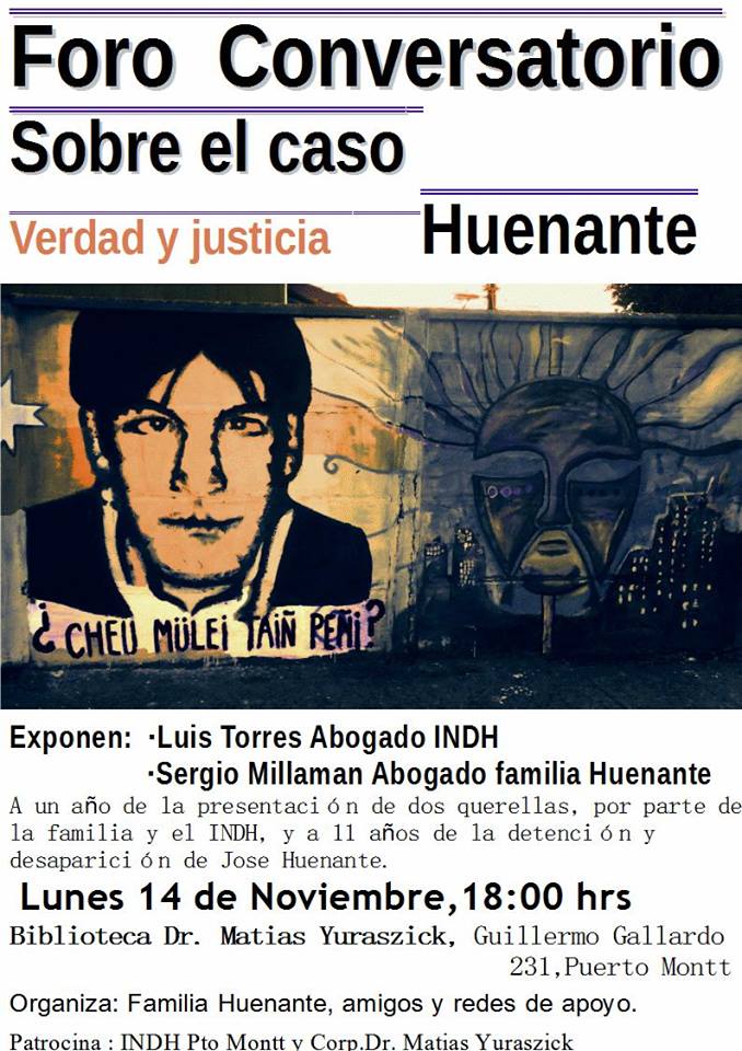 A un año de la presentación de dos querellas y a 11 años de la detención y desaparición de José Huenante, el lunes 14 de noviembre, a las 18 horas, en la Biblioteca Matías Yuraszick (Guillermo Gallardo 231) de Puerto Montt, se realizará el Foro conversatorio sobre el caso de José Huenante, en el que expondrán Luis Torres, Abogado del INDH, y Sergio Millaman, abogado de la familia Huenante.