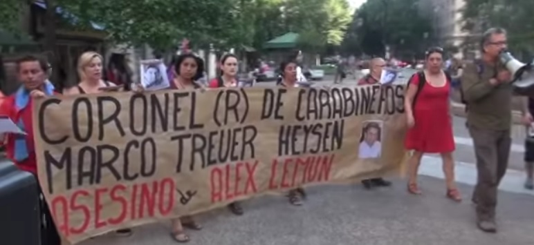 Video y nota / A 14 años de su asesinato de Alex Lemun, se funó al ex Teniente Coronel (R) de Carabineros, Marco Aurelio Treuer Heysen, quien disparó a quema ropa contra este joven comunero mapuche / Cámara y Edición Tamara TV Chile / la acción se realizó el 7 Noviembre 2016 en Santiago.