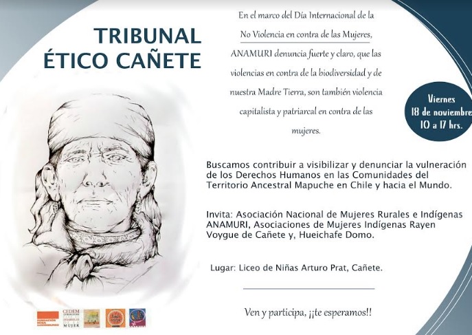 La Asociación Nacional de Mujeres Rurales e Indígenas, ANAMURI, junto a las Asociaciones de Mujeres Indígenas Rayen Voygue, de Cañete y Hueichafe Domo, de Temuco, convocan al Tribunal Ético que se realizará el día viernes 18 de noviembre, se realizará en el liceo de niñas Arturo Prat, ubicado en Condell 158, Canete, Cañete, Región del Bío Bío, Cañete, desde las 10:00 hrs. a 17:00 hrs.