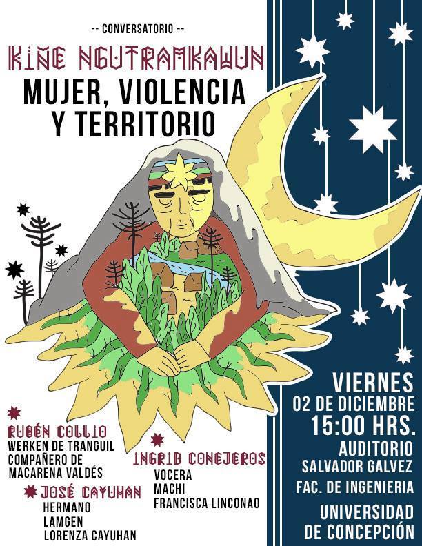 Dado el gran número de casos de violencia política ejercida por el Estado de Chile y sus instituciones hacia mujeres mapuche de nuestro territorio Wallmapu, el Colectivo Mujeres Mapuche UdeC convoca a todos y a todas a una jornada de análisis, reflexión y denuncia de la situación de violencia sistemática hacia las mujeres de nuestro pueblo. Esta instancia se centrará en los tres casos más emblemáticos del último tiempo:
