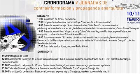 El próximo 10 y 11 de diciembre, desde las 11 horas, en Traperos de Emaus de Las Urracas de Temuco (Las Quilas 1435, detrás del Easy) se realizará la quinta versión de las Jornadas de contrainformación y propaganda Anarquista de Temuco, Wallmapu, actividad autogestionada, autoconvocada y horizontal que se realiza desde el año 2011, abierta y gratuita a toda la comunidad.