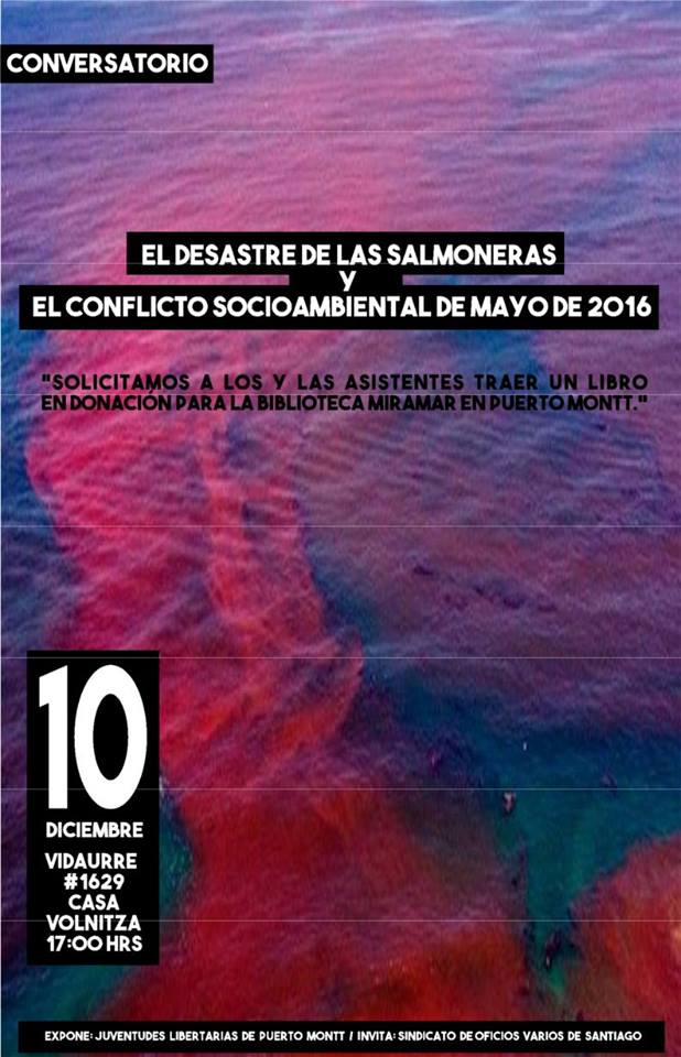 Tenemos el agrado de invitarles al conversatorio «El desastre de las salmoneras y el conflicto medioambiental de mayo de 2016», actividad organizada por el Sindicato de Oficios Varios de Santiago en conjunto con las Juventudes Libertarias de Puerto Montt, quienes nos relatarán acerca de su experiencia relacionada con las grandes protestas que se sucedieron en mayo del presente año, principalmente en Chiloé y regiones colindantes, en contra de la catástrofe ecológica de la industria capitalista salmonera y su impacto en la vida de los pueblos de los territorios afectados.