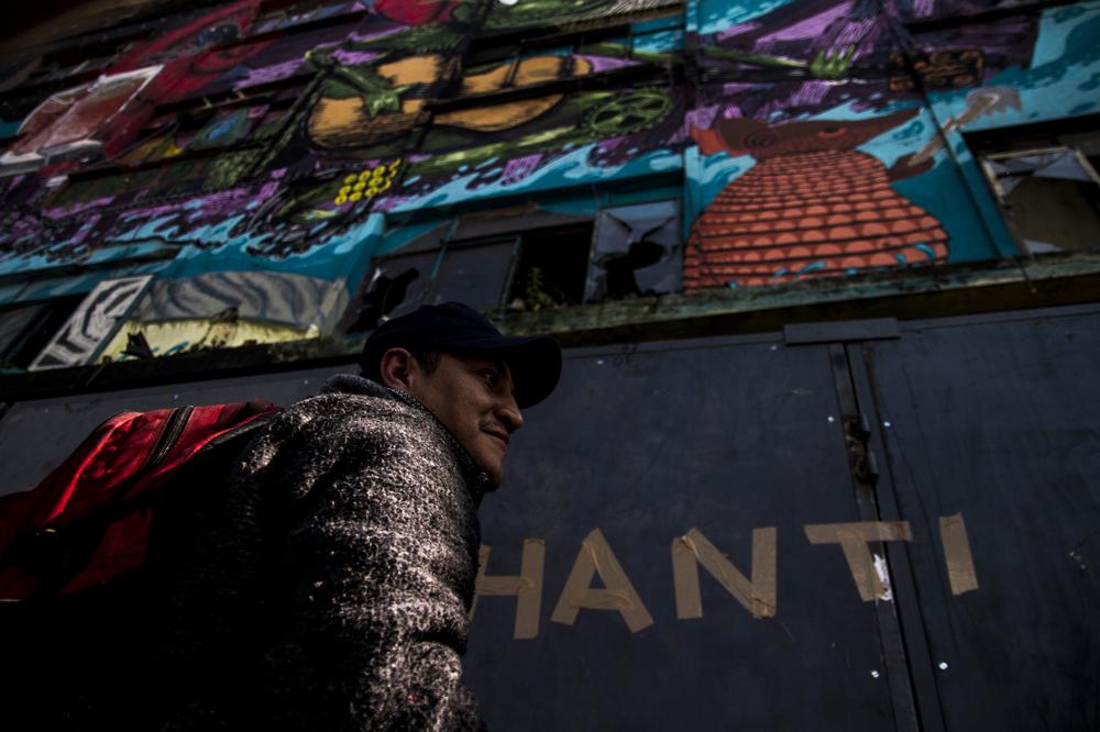 Integrante de la barricada cultural camina frente al Chanti Ollin. Algunos creen que el desalojo tiene que ver con el final de la construcción de la Torre Reforma, otros aseguran que la presión viene de Arrendadora Mexicana S.A. de C.V. Lo único seguro es que el resguardo está bajo las ordenes de la PGJ-DF.