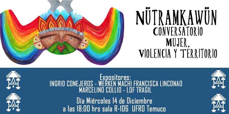 El día Miércoles 14 de Diciembre desde las 18:00 horas en la sala R-106 de la Universidad de la Frontera (Francisco Salazar 01145) de Temuco, se realizará el nutramkawun sobre mujer, violencia y territorio, organizado por la Federación Mapuche de Estudiantes FEMAE y en el que participarán Marcelino Collío de Lof Tranguil, exponiendo el caso de Macarena Valdés, e Ingrid Conejeros, Vocera de la Machi Francisca Linconao. La organización invita: