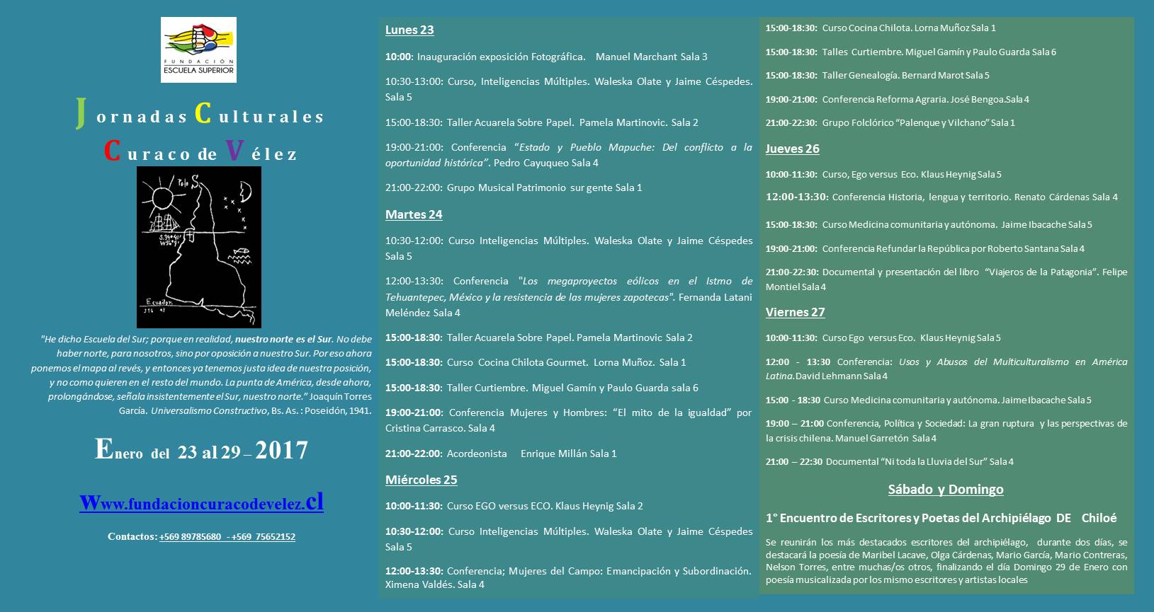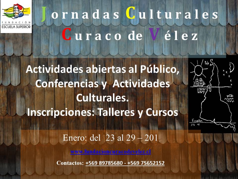 La Fundación Curaco de Vélez invita a las Jornadas Culturales que se realizarán en la sede de la Escuela Superior Campesina ubicada en la Plaza de Curaco de Vélez, Isla de Quinchao, Archipiélago de Chiloé. Se ha programado un conjunto de cursos, conferencias, talleres y actividades culturales durante toda la última semana de enero del 2017.