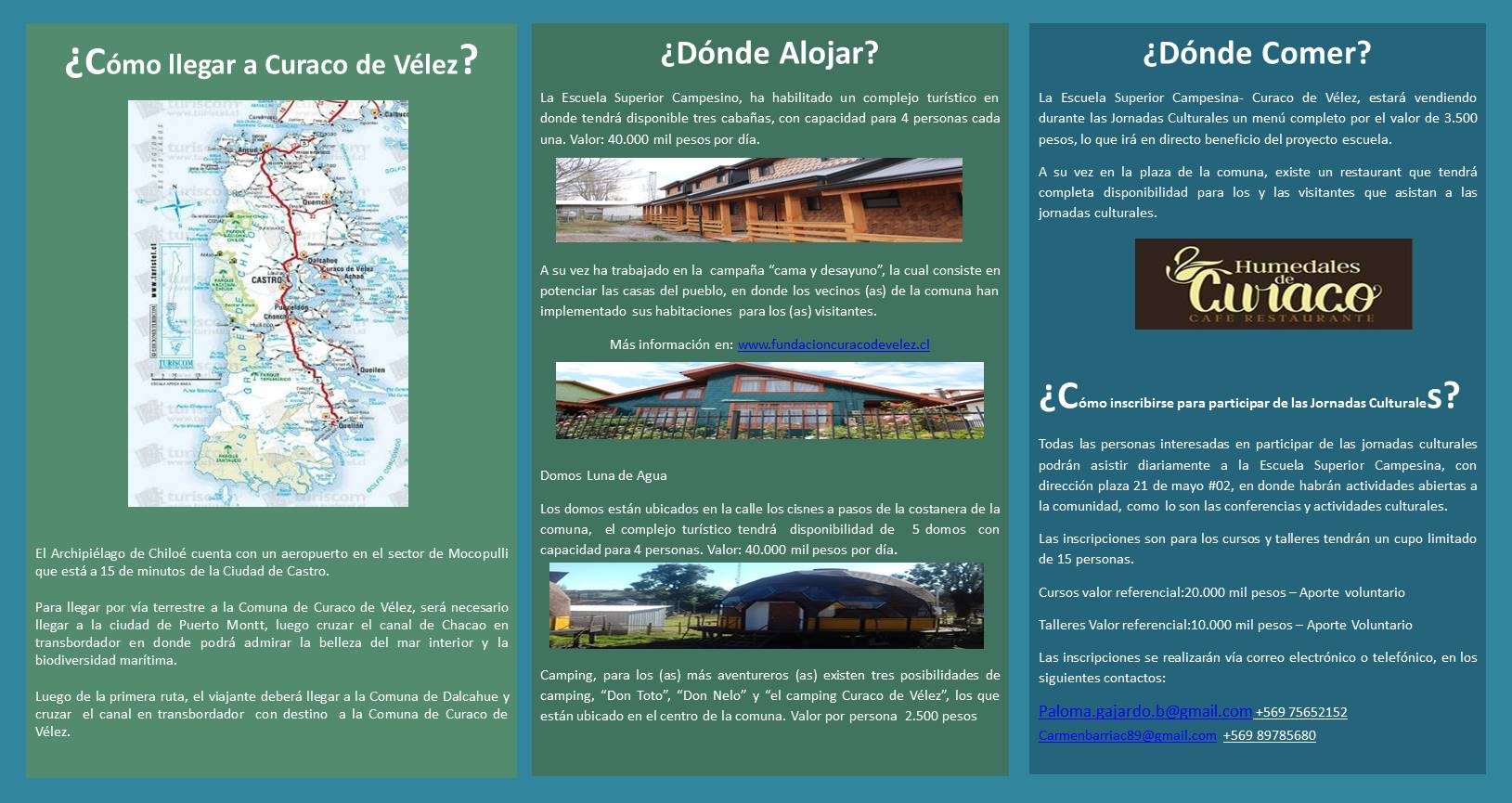 Más información en relación al alojamiento y a las jornadas culturales, en: www.fundacioncuracodevelez.cl