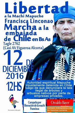 Nuevas manifestaciones que exigen justicia por la Machi Francisca Linconao. Este sábado 10 de diciembre del 2016 se realizará una charla denominada “Mujer mapuche entre la lucha y la persecución”, que abordará el cómo se construye un escenario represivo con la ley antiterrorista, sus efectos y el protagonismo de las mujeres indígenas en las resistencia. Señala la organización que acompañará esta charla: La werken/vocera de la Machi Linconao, Ingrid Conejero, junto a las dirigentes y activistas Mapuche: Moira Millan y Juana Linconao.