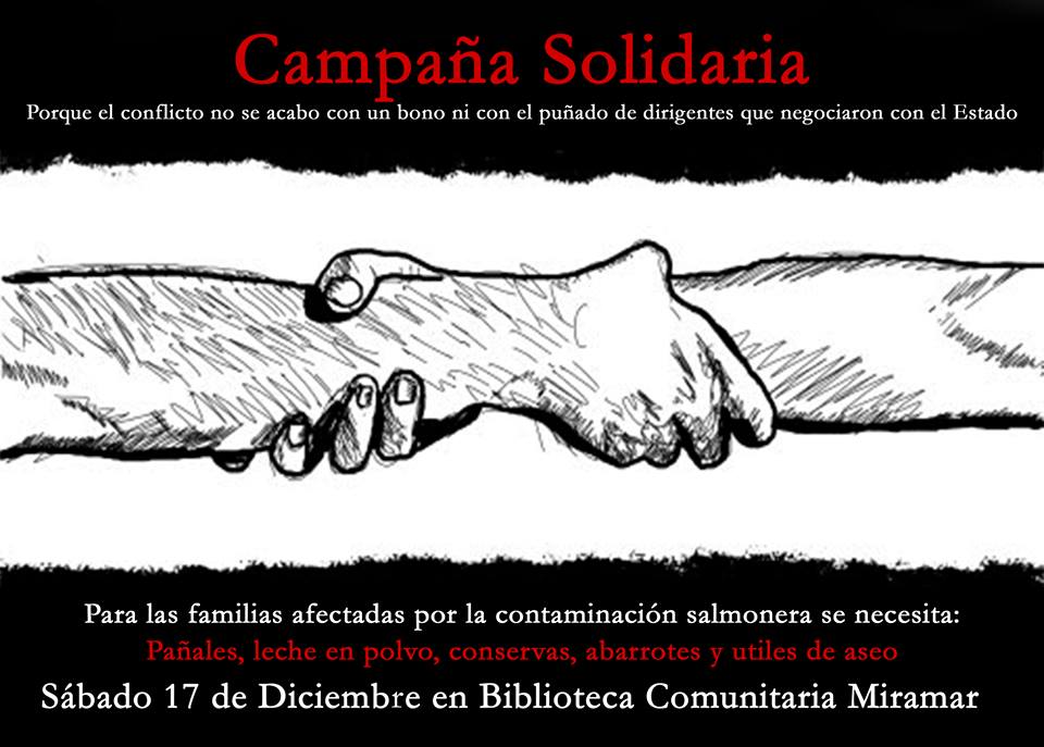 En Puerto Montt, se iniciará la Campaña solidaria en apoyo a las familias afectadas por la industria salmonera», actividad que el día sábado 17 de diciembre recolectará útiles de aseo, abarrotes, conversas, entre otros en la Biblioteca Comunitaria Miramar.